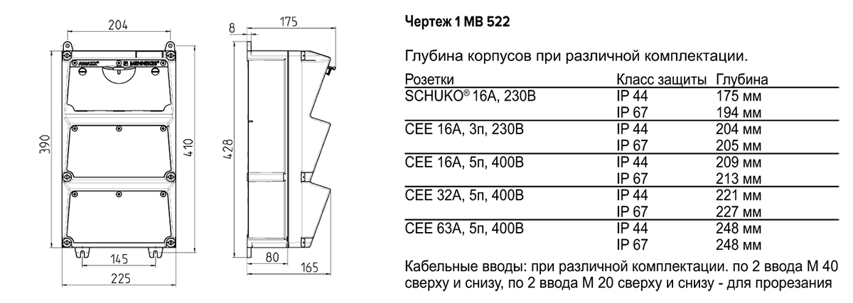 Комбинация розеток серии AMAXX, 3 розетки SCHUKO 16А, 230В и 1 розетка СЕЕ 32А, 6ч, 5п, 400В, 50-60Гц., общее 4-х полюсное УЗО 40А 30мА, защитные автоматы 3-х полюсный на ток 32А с х-кой "С" - 1 шт. и 1-х полюсные на ток 16А с х-кой "С" - 3 шт., подключение до 2-х кабелей до 5х25 кв.мм, размер 225х390х227 мм, цвет основания черный, лицевая шарнирная часть серая, с повышенной устойчивостью к агрессивным средам из АМЕЛАНА, IP67.