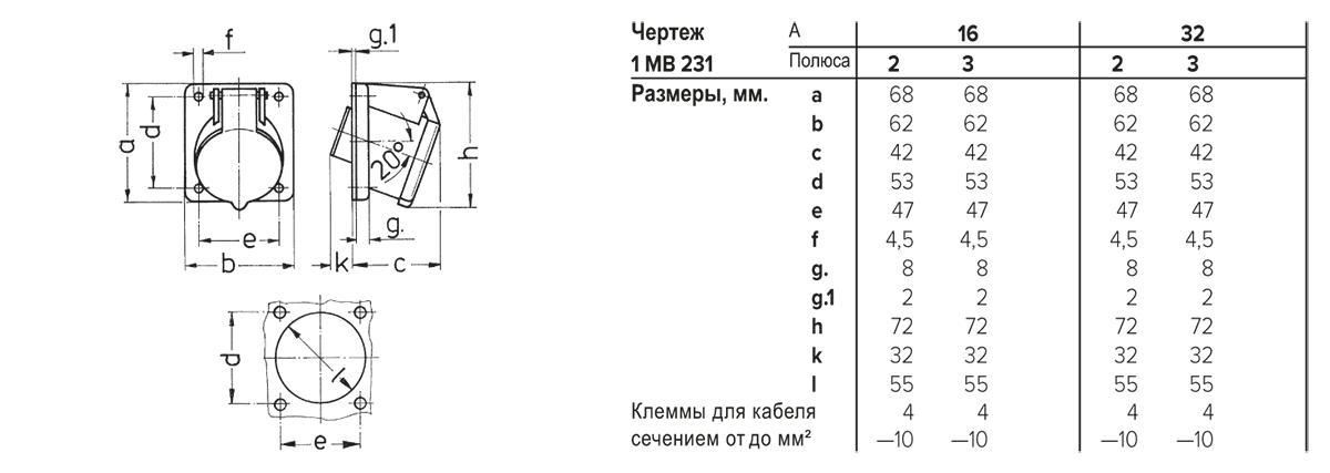 16A, 2п, 20-25B, 50-60Гц. Панельная розетка, угол наклона 20 гр., винтовые клеммы, сечение кабеля 4 - 10 кв.мм, фланец 68х62 мм, фиолетовая, IP44.